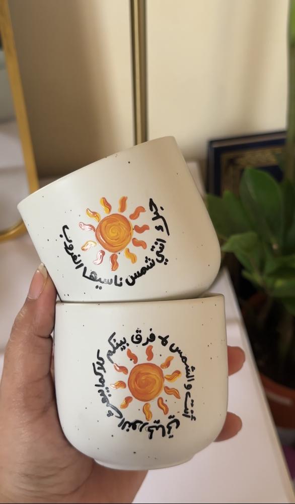 رسم يدوي لذلك قد تختلف بعض السمات مثل (درجه اللون،حجم الرسمة،الخط ،...) من كوب لاخر .